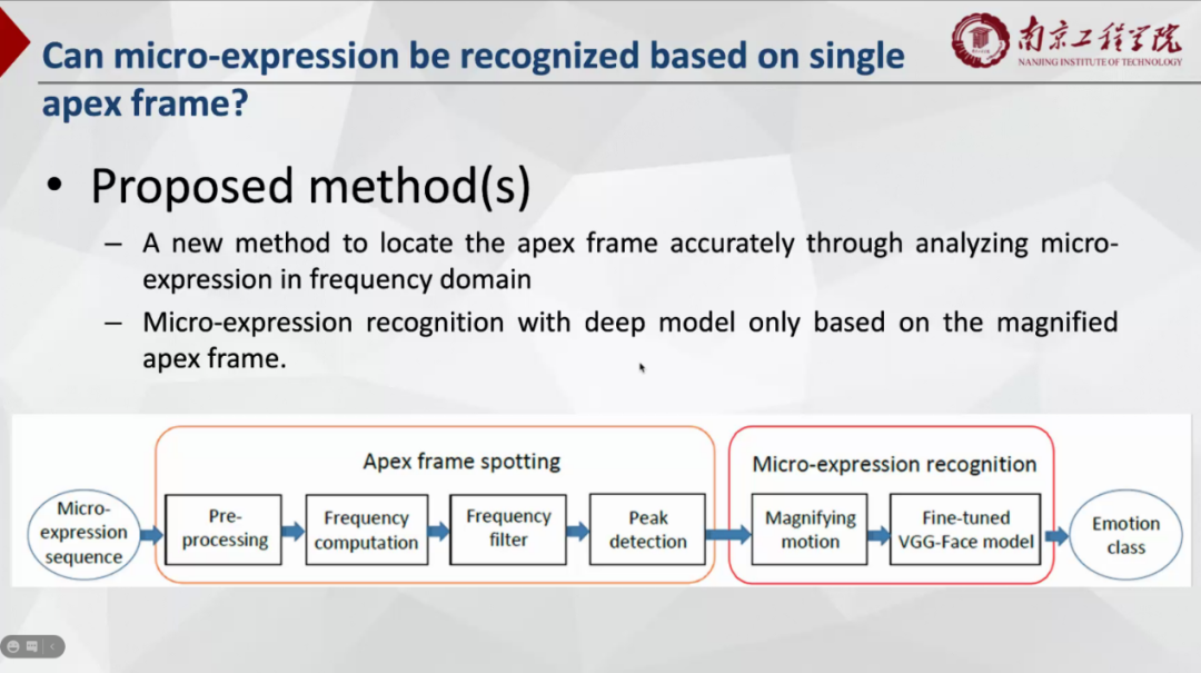 在结合深度学习方法的部分,由于基于视频的微表情识别研究受到样本数目少的限制,存在严重过拟合的情况,黄晓华教授及其团队探索了基于微表情峰值帧和结合深度学习的识别方法。首先通过在频域对微表情片段进行分析,得到该片段中微表情动作的峰值帧,在放大等预处理后,通过VGG-Face模型进行微表情的情感分类。
