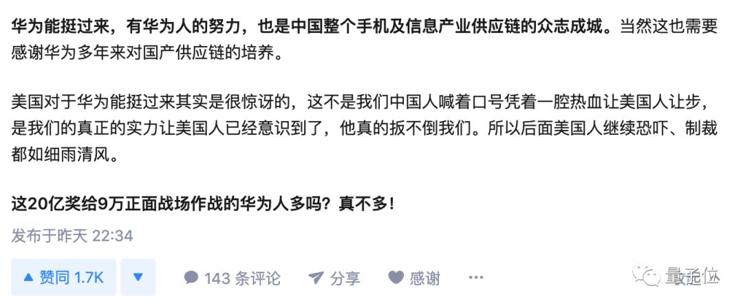 虽然20亿奖金并不是每一位华为员工都有份,但业务连续性项目组以外的华为员工也表示:资瓷。