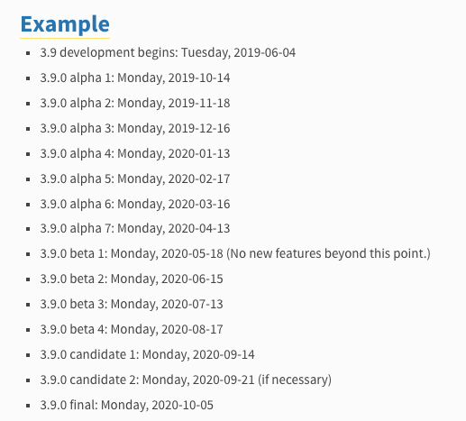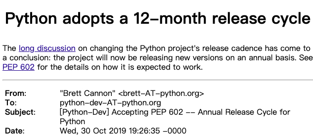 PEP 602 的作者是 Python 3.8 和 3.9 的发布经理 Łukasz Langa,Python 3.8 已经释出,新的发布周期将从 Python 3.9 开始采用。