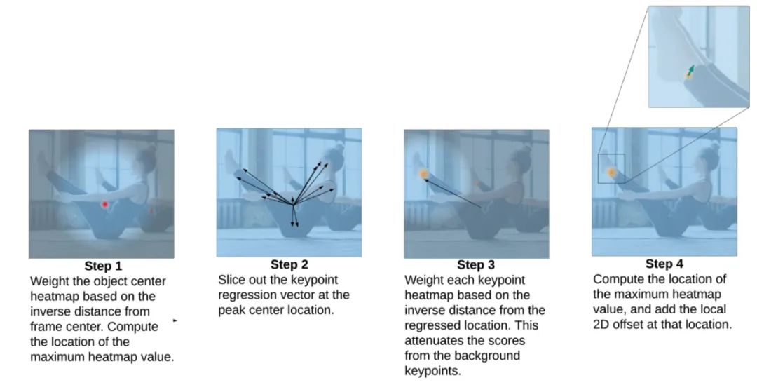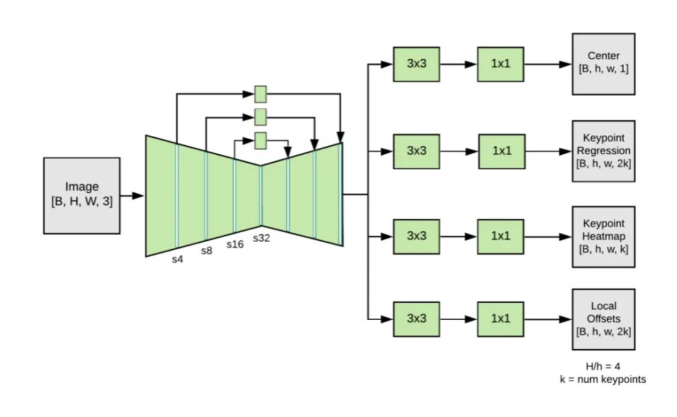 通过官方博客的只言片语以及Netron可视化网络,对模型有了初步了解,官方宣称是基于CenterNet做的修改,但是修改了很多(The prediction scheme loosely follows CenterNet, with notable changes that improve both speed and accuracy)。具体来说,使用了mobilenetv2+fpn作为backbone,输出四个header,最后经过后处理输出一个最靠近图片中心的人的关键点。由此可知,它也是属于Bottom-Up的流派,同时通过关键点回归的范围进行加权,只输出最靠近中心的一个人的关键点,和我们的场景绝佳匹配,因为就Lightweight OpenPose而言,其余人的PAF信息其实也是多余的。