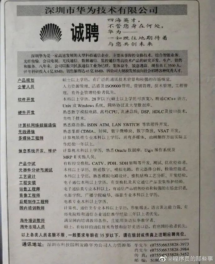 图为华为 1996 年招聘启事,要求所有岗位应聘者年龄在 35 岁以下。图片来源:微博 @程序员的那些事