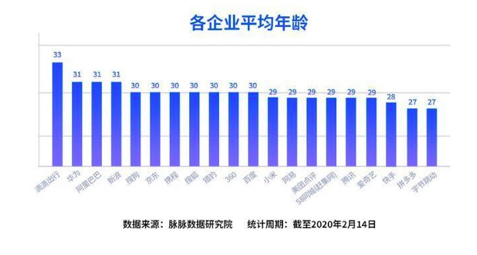 今年 3 月脉脉研究院发布的《互联网人才流动报告》统计,19 家企业的人才平均年龄为 29.6 岁,其中滴滴算是“最老”的,员工平均年龄为 33 岁,最年轻的是字节跳动和拼多多,人才平均年龄仅为 27 岁。