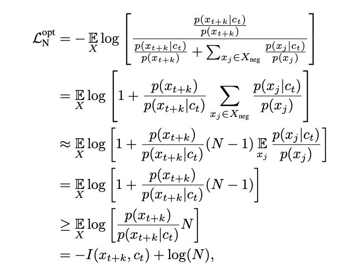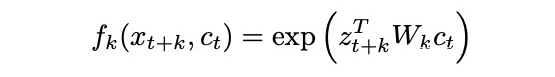 由于没有办法获得到 的联合概率,因此文章通过建模两种样本的密度比的方式来绕过联合概率(两种样本:真实样本和采样出来的负样本),其中 表示 的预测和未来 的相似程度, 是将 转换到 空间,然后用内积来表示相似程度,文章也证明了 。