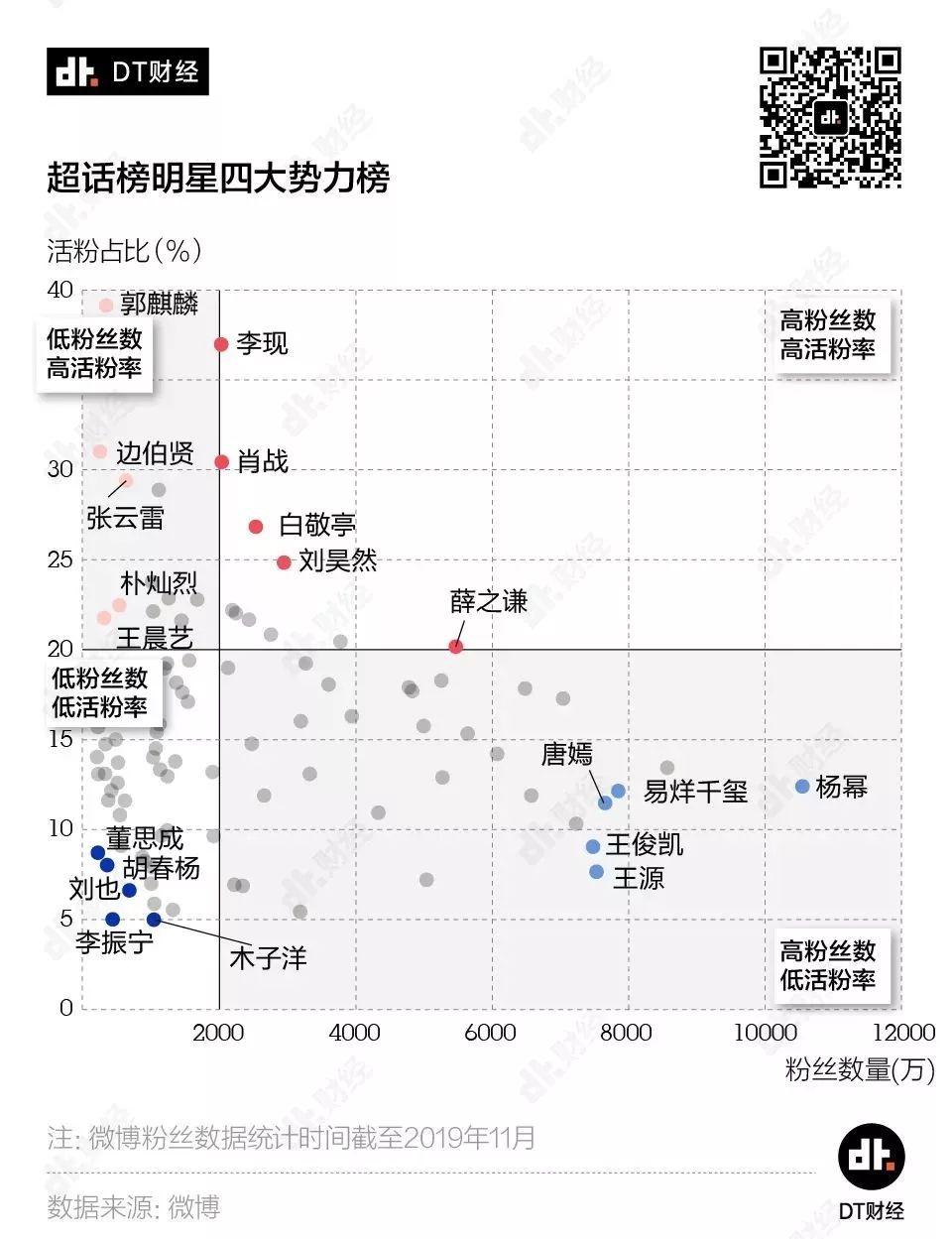 为了进一步吃瓜,我们顺手根据活跃粉丝数量以及活粉占比,把超话榜明星分为了四大象限:高粉丝数低活粉率、高粉丝数高活粉率、低粉丝数高活粉率、低粉丝数低活粉率。