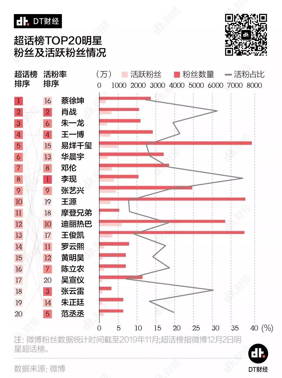 从具体名单来看,超话榜排位第13的张云雷,活粉率高居第3,仅次于今年最红的李现和肖战,而位列榜首的蔡徐坤,活粉率仅11.86%,排第16位。