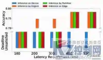 图6记录了深度学习模型不同的推理方式在不同的时延需求下的性能比较。在非常低的时延需求(100ms)下,这四种方法都不能满足需求。随着时延需求的上升,在200ms到300ms之间,本文框架的深度学习模型推理要比其他方法更早地实现工作。