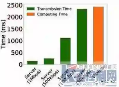 当前,针对运行在移动端设备的智能应用,实现深度神经网络模型推理的方法要么是在移动端设备上直接执行,要么将其加载至云数据中心或边缘服务器执行。但这两种方式都可能存在较差的性能(即端到端时延),难以很好地满足实时移动智能应用,如AR/VR、移动游戏和智能机器人[2]。图2展示了经典卷积神经网络AlexNet在不同带宽环境下基于边缘服务器方式执行的性能表现。不难发现,其性能取决于输入数据从移动设备传输到边缘服务器所花费的数据传输时间(取决于带宽),因此,基于服务器方式的深度学习模型推理方法的端到端延迟对可用带宽高度敏感。考虑到带宽资源在实际环境中的稀缺性(用户之间或应用之间的带宽竞争)以及移动设备计算资源的限制,直接在设备端运行和在边缘服务器运行的方式都很难以实时地支持许多新兴的具有严格时延要求的移动智能应用。