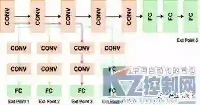 (1)分析边缘服务器与终端设备性能,针对不同类型的深度学习模型网络层,如卷积层,池化层等,生成基于回归模型的时延估算模型。在估算网络层的运行时延时,Edgent会对每层网络层进行建模而不是对整个深度学习模型进行建模,不同网络层的时延是由各自的自变量(如输入数据的大小、输出数据的大小)决定,基于每层的自变量,我们可以建立回归模型估算每层网络层的时延;(2)训练带有多个退出点的分支网络模型,从而实现模型精简,这里我们采用BranchyNet分支网络结构,在BranchyNet结构下,我们可以设计并训练出带有多个退出点的分支网络。图4展示了具有5个退出点的AlexNet模型,目前多退出点的深度神经网络模型由开源框架BranchyNet [14]支持。需要注意的是,性能分析取决于设备,而深度学习模型是取决于应用的,因此在给定设备的情况下即限定边缘服务器与终端设备,以上两个初始化操作在离线阶段只需要完成一次。