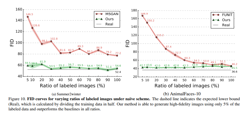 下图分别展示了在Summer2wendor和AnimalFaces-10上使用class-wise FID的定量结果。随着比值(γ)的降低,基线模型的性能显著下降,而作者提出的模型无论γ如何,都将FID值维持在60和45左右。