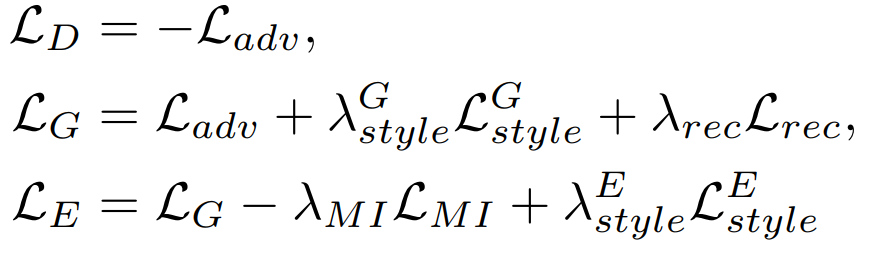 。这部分是为了解决翻译模式应该提供包含目标域视觉特征的逼真图像。为此作者采用了三种损失:1)对抗性损失以生成逼真的图像;2)风格对比损失以鼓励模型不忽略风格代码;3)图像重建损失以保持域不变特征。