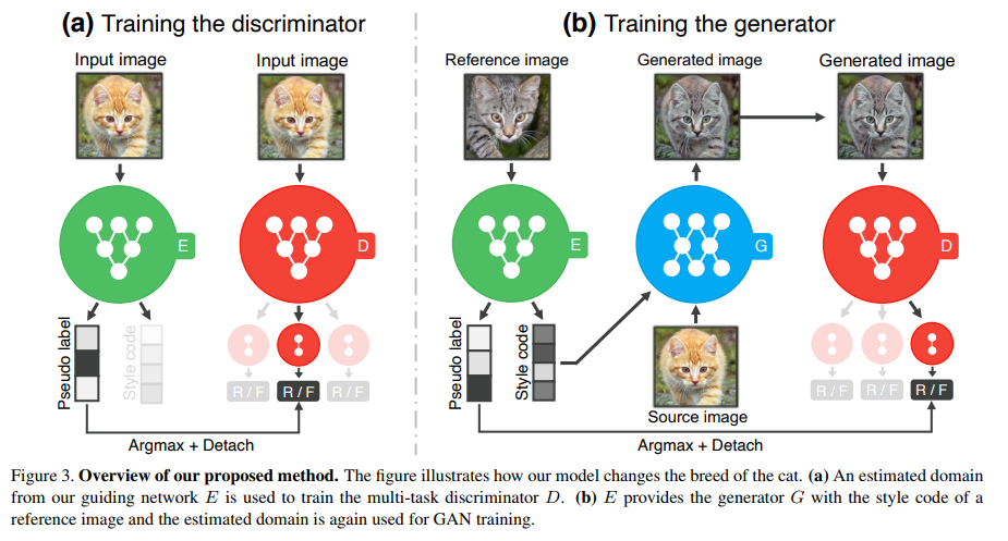 图注:方法概述如上,上图说明了模型转换猫品种的过程:1.使用引导网络的估计域训练多任务鉴别器;2.引导网络为生成器提供参考图像( reference image )的样式代码。另外,估计域再次用于GAN训练。