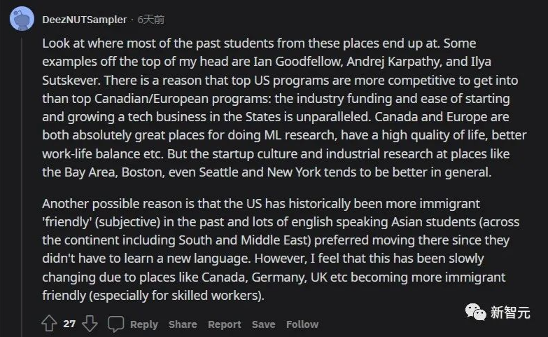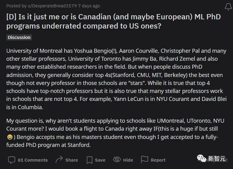 他在帖子里提出一个有趣的问题——为什么人们谈起机器学习的博士项目时,总是优先想到美国的学校,而不是加拿大或欧洲的呢?