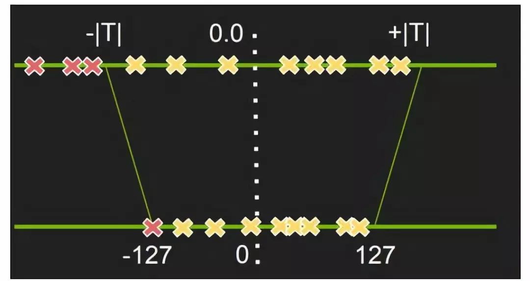 为了解决这个问题,TensorRt 中会对每一层的数据分布进行统计,然后根据得到的分布确定一个阈值(如图片 9)。在映射的过程中,阈值之外的数会被统一映射到-127 和 127 之 间,阈值之内的数据会假设为一个均匀分布然后进行映射。这样就可以保证在加快速度的同时也不至于有较大的精度损失。