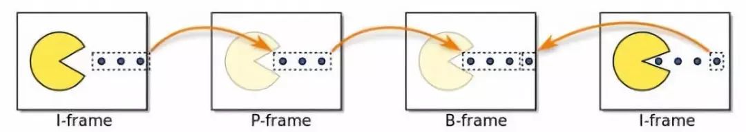 主流的视频编码方式中,每个视频主要包含三种图片帧,分别叫做:Intra-coded frame(I 帧),Predictive frame(P 帧)和 Bi-Predictive frame(B 帧)。其中 I 帧是一张完整的图片。P 帧记录了与之前的帧的差别,所以在解码 P 帧时必须要参考之前的图片帧。而 B 帧不仅需要参考之前的图片帧,还需要参考之后的图片帧才能完整解码。图片 4 阐明了这三个概念 [2]。