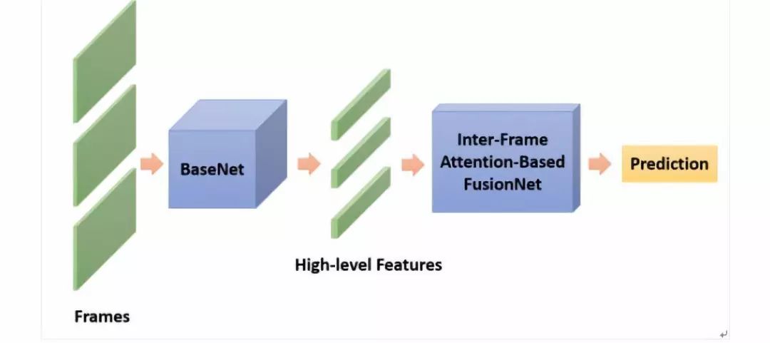 BaseNet 输出的高层的特征往往具有很强的语义信息,但是却没有时间上的融合。所以我们特别设计了一个基于帧间注意力机制的融合模型,将 BaseNet 提取的不同帧的特征作为一个输入送入融合模型中,最终由融合模型得到预测的结果。由于融合模型比较小,推理速度很快,而且参数量较少,也比较容易训练。整个模型在 mxnet 上进行构建和训练。基于这样的设计,我们的模型可以得到很快的推理速度,同时又不会损失太多精度。