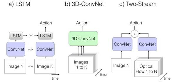 目前主流的视频分类的方法有三大类:基于 LSTM 的方法,基于 3D 卷积的方法和基于双流的方法。图片 5 展示了这三种框架的大体结构 [3]。