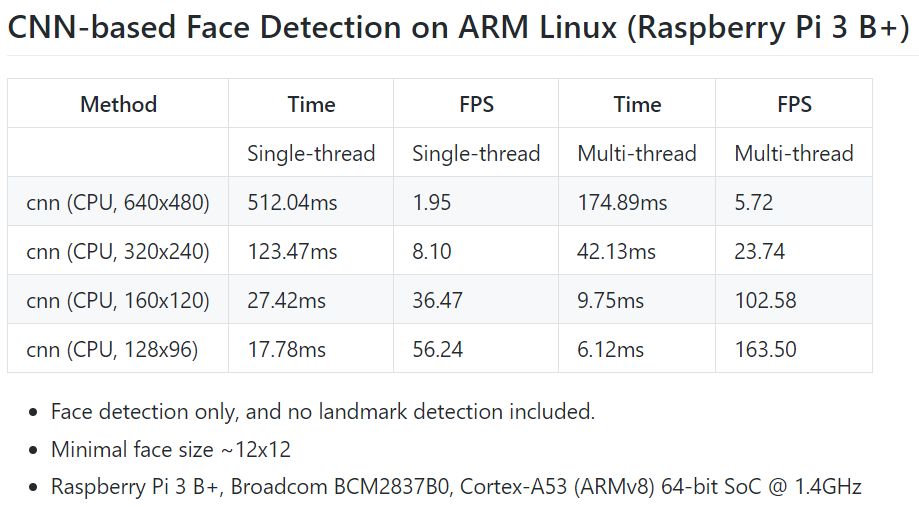 在ARM Linux (Raspberry Pi 3 B+)上进行人脸检测实验结果
