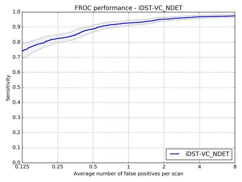 而且在医疗影像处理方面,国家大厂也是成绩斐然。比如在前年的肺结节检测大赛 (LUNA16)上,阿里云 ET 就在1186 个肺结节(75% 以上为小于 10mm 的小结节)的样本中, 在 7 个不同误报率下发现的肺结节平均成功率达到 89.7%。(注:LUNA大赛中使用召回率,是指在样本数据中成功发现的结节占比,这里使用成功率替代),下图显示了 ET 在不同误报次数下的召回率情况。