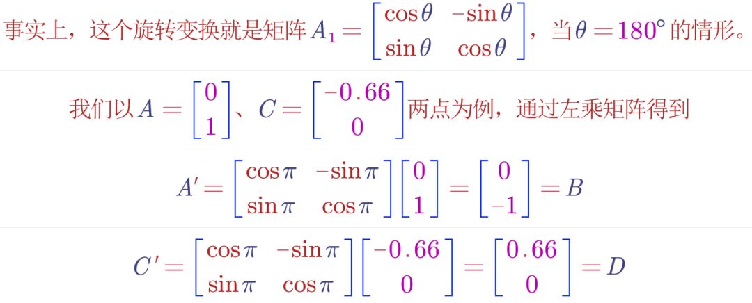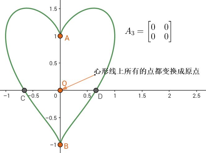 其余的点同理,于是我们得到了颠倒的心形(旋转了180度),从图像很容易看出来,旋转变换后的图形依然是二维的,所以,这个旋转矩阵A1的秩就是2。