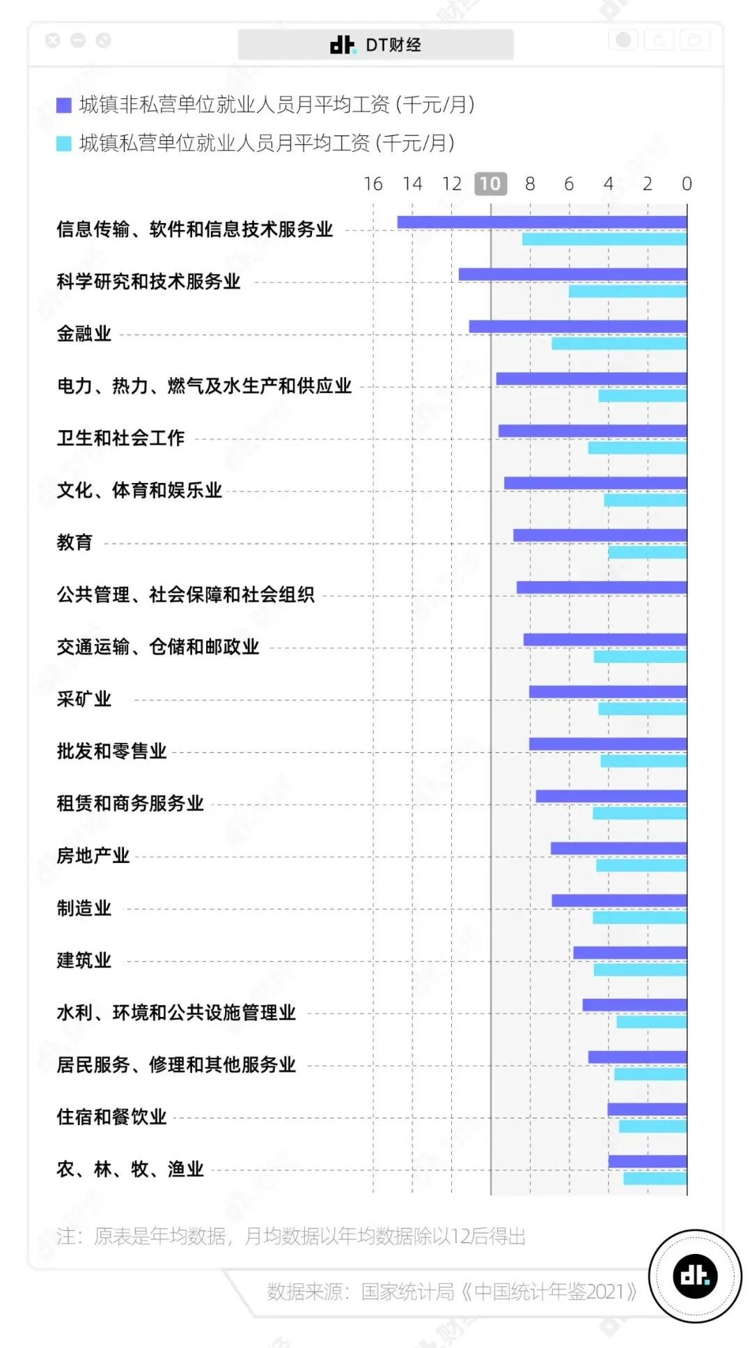 国家统计局《中国统计年鉴2021》的数据显示,2020年各行业平均月工资最高的三个行业分别是:信息传输、软件和信息技术服务业,科学研究和技术服务业,以及金融业。也只有在这三个行业中,就业人员平均月工资超过1万元。