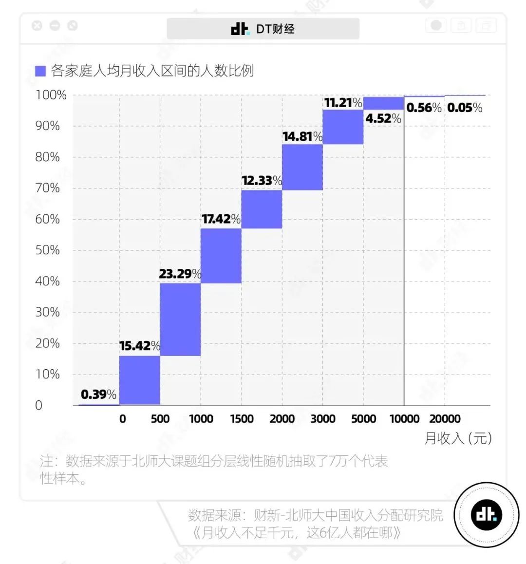 CHIP的最近一次调查时间为2018年,研究院官网并未公布相关数据,但该院研究人员在财新发布的一篇文章透露了部分数据结果,分层抽取了7万个样本的数据显示:人均可支配月收入(扣除个人所得税等之外可用于实际使用的可支配收入)在10000元以上的家庭占比仅为0.61%,人均可支配月收入在5000-10000元区间的是4.52%;而大部分中国家庭人均可支配月收入在500-1500元这个区间,占比约40.71%。