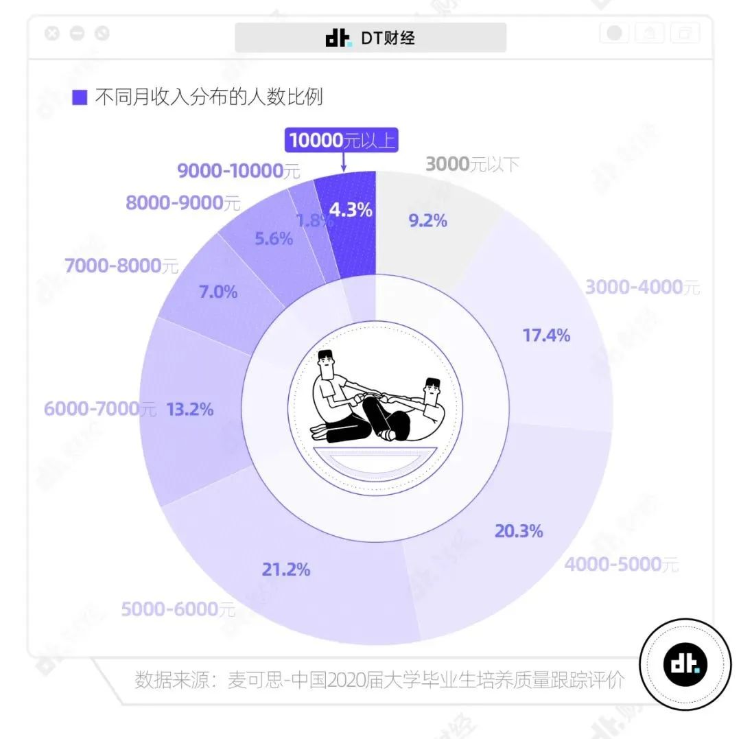 麦可思《中国2020届大学毕业生培养质量跟踪评价》的数据显示,月收入(税前,包含工资、奖金、津贴等在内)在1万元以上的本科应届毕业生仅占该群体总人数的4.3%,与此同时,有68.1%本科毕业生月收入在6000元以下。
