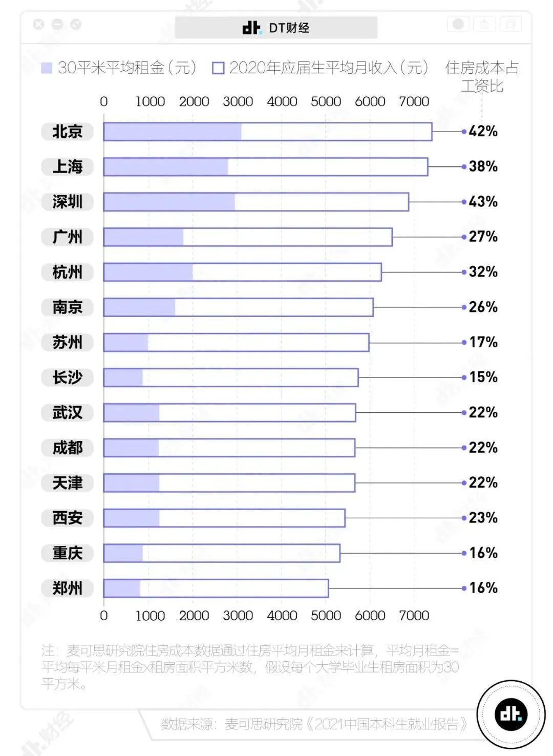 对于普遍租房的年轻打工人来说,其中最明显直观的差别就是每个月的房租。根据麦可思研究院《2021中国本科生就业报告》的数据,在北京和深圳,2020届毕业生的住房成本占工资比已经超过了40%,其次是上海、杭州,分别占比38%、32%。而在重庆、长沙这些规模相对稍小的城市,虽然平均月收入更低,但只有15%左右的工资会被花在房租上。