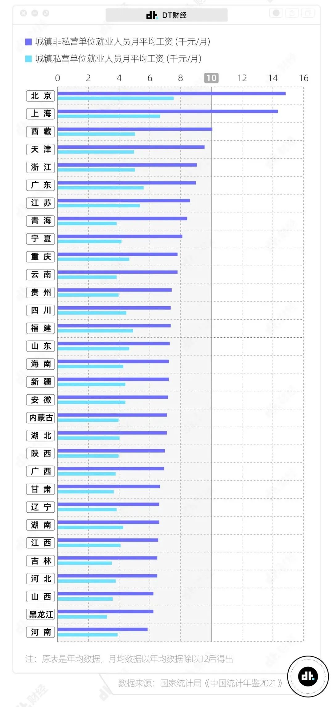 国家统计局在《中国统计年鉴2021》中公布了全国各地区就业人员的平均工资(税前,包含工资、奖金、津贴等在内),我们进行了计算排名,可以看到,位列前三的地区分别是北京、上海,和西藏,广东仅排在第六。