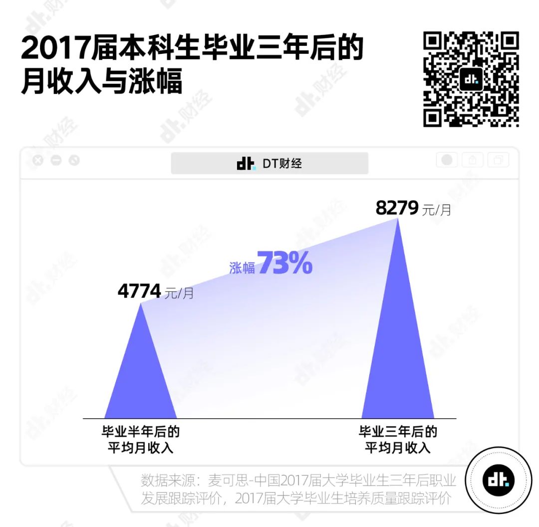 即便是在工作三年后,也有相当大一部分本科生的月收入没有达到1万元。数据显示,毕业三年后,本科生的平均月收入为8279元。