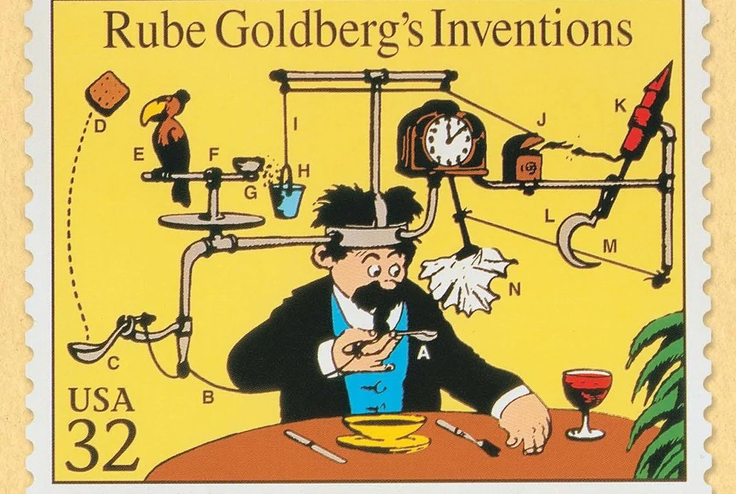 这个操作更像是Rube Goldberg,这是一种被设计得过度复杂的机械组合,以迂回曲折的方法完成简单的工作,例如倒一杯茶。设计者必须计算精确,令机械的每个部件都能够准确发挥功用,因为任何一个环节出错,都极有可能令原定的任务不能达成。