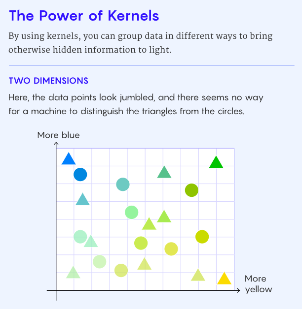 简单讲,内核就像镜头,可以让算法以不同的方式对数据进行分类,找到有助于区分未来输入的模式。Temme 说,这是一种以新的视角重铸信息的技巧,可以将原本隐藏在数据中的强大关系归零。