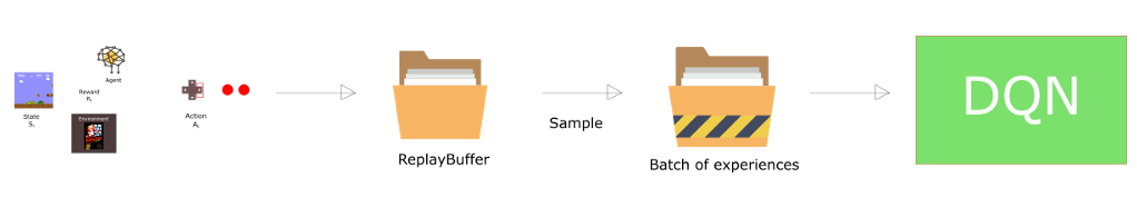 其中,Deep Q 的输入为状态信息,可以是一系列图片,输出为执行不同动作后,Q 值的期望。为了更好地利用观测到的经验数据,训练 DQN 的时候常采用经验回放机制 Experience Replay,经验回复机制主要能够解决两个方面的问题,一个是避免网络忘掉以前学到的经验信息,二是神经网络的训练数据是独立分布的,而强化学习生成的数据一般是序列化的,通过经验回放机制可以打破这种顺序结构。经验回放机制如下所示: