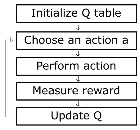 Q-function 以状态和行动作为输入参数,返回输入状态对应的期望累积奖励。Q-Learning 算法通过迭代化地优化 Q-Table 得到 Q-function,算法的学习流程如下所示: