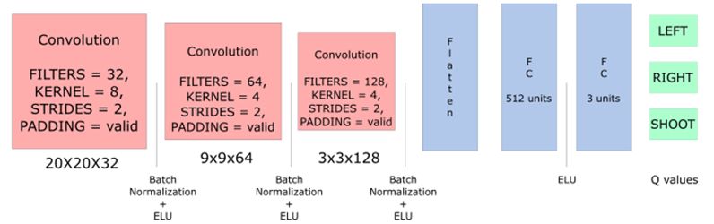 其中,首先读取游戏界面图像,为了减少训练数据大小,经过图像预处理,把游戏图像转换成 84*84 大小的灰度图片;然后,为了处理智能体所处状态的时序变化,比如移动方向,把四张预处理后的图像堆叠起来,组成 84*84*4 大小的训练数据。射击场景使用的 Deep Q-learning 的网络模型结构如下图所示:
