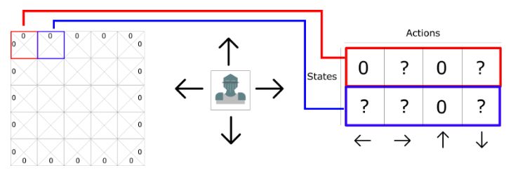 其中,图中的每个小方格表示智能体的状态,共有 5*5=20 种状态,对应的每个状态智能体可采取 4 个行动,为向上、向下、向左、向右移动,如果为 0 表示不可以移动。这样依据状态和行动,可生成表格 Q-Table,每个单元格中的分数表示对状态采取对应行动后产生最大期望奖励的度量值。表格中的 4 列,分别表示向左、向右、向上、向下移动;表格中的每行表示智能体的状态。对应于上节提到的老鼠吃奶酪的游戏,生成 Q-Table 后,选择对应状态的行,得分最高的行动。Q-Learning 算法的主要目的是能够学习得到 Q-function,如下所示: