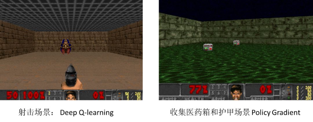 本节主要介绍 ViZDoom 中的两个场景:射击场景,使用了 Deep Q-learning 算法;收集医药箱场景,使用了 Policy Gradients 算法。两个场景如下图所示: