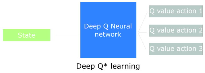 Q-Learning 算法主要是通过不断更新 Q-Table 来学习到优化的 Q-function。但是,对于大的智能体状态空间,比如说围棋、射击游戏,很难定义和更新 Q-Table,Q-Learning 算法将不起作用。Deep Q-Learning 算法,可对智能体的状态,通过神经网络算法,来逼近该状态下执行 action 后的 Q-Value 值。如下所示: