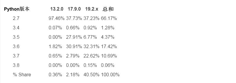 我们可以清楚地看到,Python 2.7是Twisted最流行的平台,其次是Python 3.6和Python 3.7。Python 3.4(当前版本不支持的一个Python版本)和Python 3.5正在被淘汰,但是这些旧平台的用户数量仍然有当前Python稳定版本的一半。Python 3.8(目前处于beta版)实际上是一个舍入错误(正如预期的那样)。