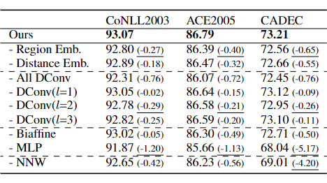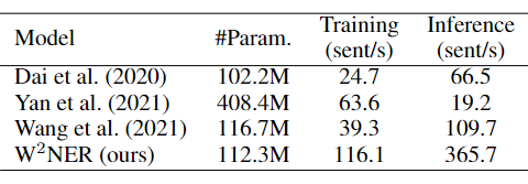 通过进一步的消融实验,我们探索了不同参数和部件对整体框架的影响。此外我们模型在相对较小的参数情况下,其训练和推理速度超过了多个非连续实体识别模型。