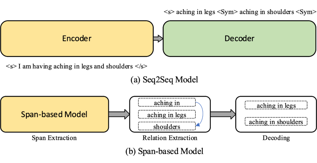 以图 1 为例,“aching in legs”是一个扁平实体,“aching in shoulders”是一个非连续实体,两者在“aching in”上重叠。以上三种 NER 类型可概括为统一命名实体识别(Unified Named Entity Recognition,UNER)