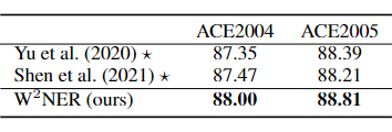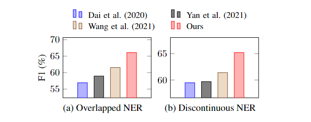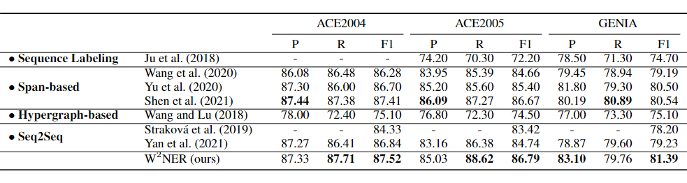 表 1-5 分别展示了上述任务和数据集上与基线模型对比的结果。实验结果表明,我们提出的基于词对关系抽取的方法,通过对邻接关系和头尾关系的识别,可以同时解决扁平实体、重叠实体和非连续实体的三种子任务,并在 14 个数据集上的效果都优于之前的工作。