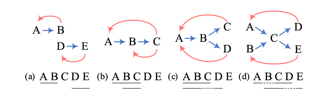 在解码阶段,模型需要处理不同的词对关系。模型的预测结果是词之间的关系,这些词和关系可以构成一个有向图,其中词是节点,关系是边。模型的解码目标则是要寻找从一个词到另一个词的由邻接关系连接起来的路径,每条路径其实代表着一个对应的实体。而头尾关系则可以用于判断实体的类型和边界,除此之外还具有消歧的作用。图 4 从易到难展示了 4 个解码类型的例子。