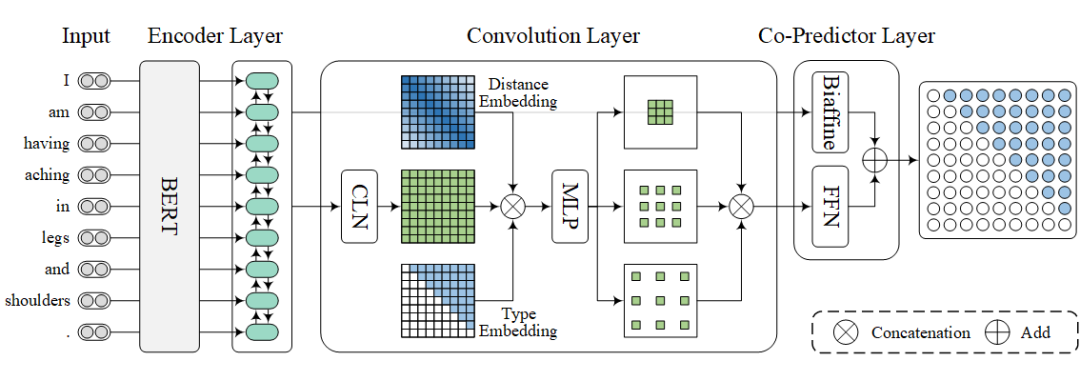然而我们在针对三种实体类型的共性进行深入挖掘后,认为词语之间在语义上的连接特征才是 UNER 最为关键的问题。例如图 1(a)中,识别扁平实体“aching in legs”相对而言是较为简单,因为这个实体所包含的词是天然相邻的。而要识别出非连续实体“aching in shoulders”,则一个成功的 UNER 模型需要准确高效地片为片段“aching in”和片段“shoulders”之间在语义上的邻接关系进行建模。