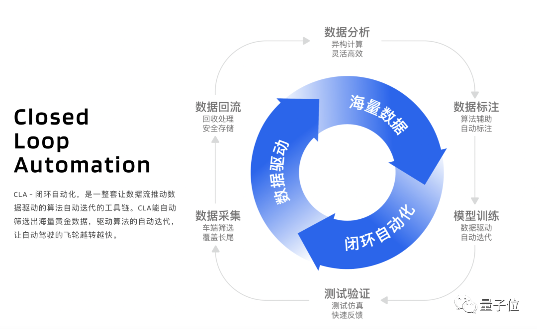 获取海量数据之后,闭环自动化工具链则包含数据采集、回流、分析、标注、模型训练及验证环节,用来帮助数据和算法之间形成快速迭代的反馈闭环,这个工具链可以自动筛选出海量黄金数据,驱动算法自动迭代,让“飞轮”越转越快。