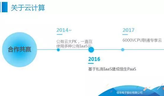 恒生在 2014 年就觉得云计算技术比较成熟了,可以引入到行业应用。然后我们把市面上的公有云基本都调查了一遍、进行深入的 POC 验证,对我们的核心产品进行改造确保适应云计算环境。