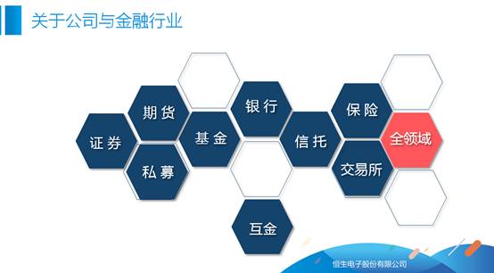 恒生涉及的金融业务非常全,像证监会监管的证券、期货,基金包括私募基金、银监会监管的银行和信托、保监会监管的保险,以及作为金融行业基础设施的各类交易所、登记托管机构。新兴的互联网金融也是我们服务很重要的一块,所以主流金融机构基本都有涉及并且深耕多年。