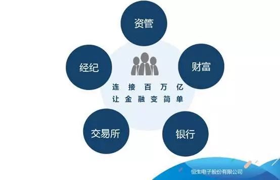 第三是财富管理。简单的讲,现在就是各种理财产品的销售。销售募集来的资金,由专门的资产管理机构去投资,这时候就要用到恒生的资产管理方面的各类系统。