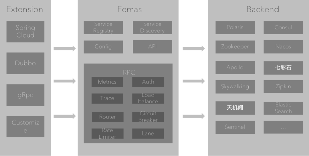 微服务协议扩展层:实现各个协议框架的治理插件,将Femas的能力在框架合适的地方中进行埋点,做到不同协议框架的轻量接入,并且能在同一套平台上面统一管理。