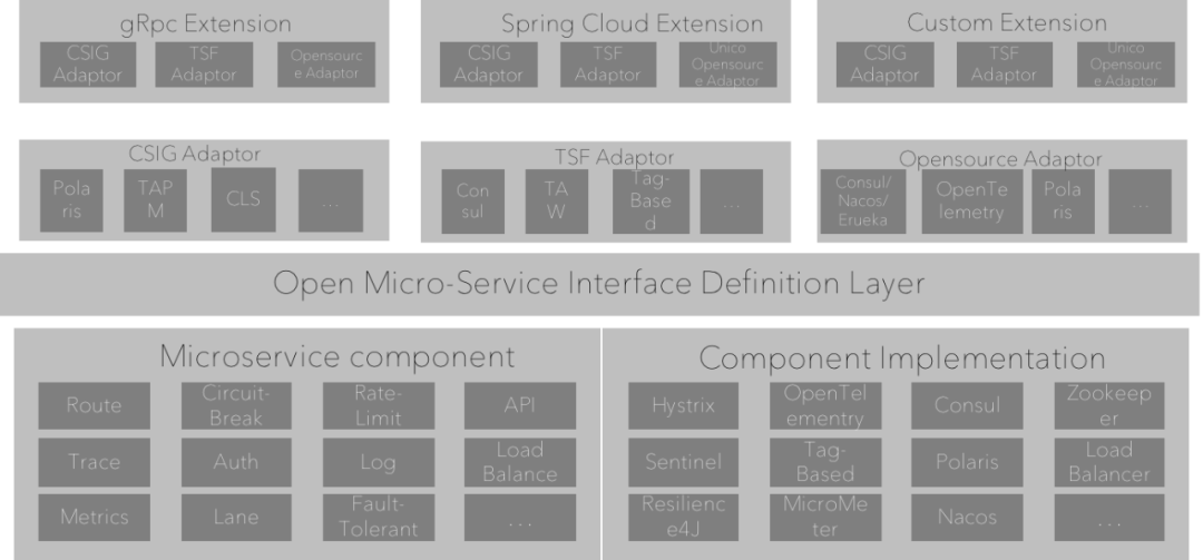 腾讯内部很多公有云服务都使用了公司内部的组件,比如注册中心用的是北极星,配置中心是七彩石等等。对外交付时,内部组件由于种种原因无法交付,所以这些项目需要同时维护不同的分支,一个用于维护内部组件,另一个则用于维护对外的各种组件。我们希望有一套框架,能够实现基础组件的灵活可替换,自由组装Paas平台需要的微服务组件能力矩阵,支持Paas平台多元化的场景。