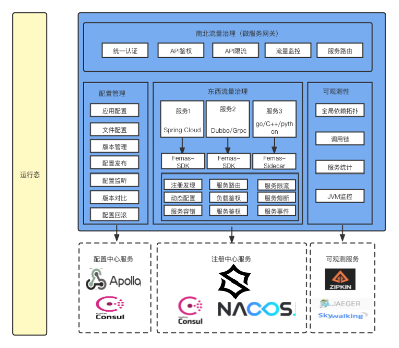 - 目前femas已经完成的运行时能力有:注册中心管理、服务治理、服务可观测、配置管理,其他运行时能力仍待完善。